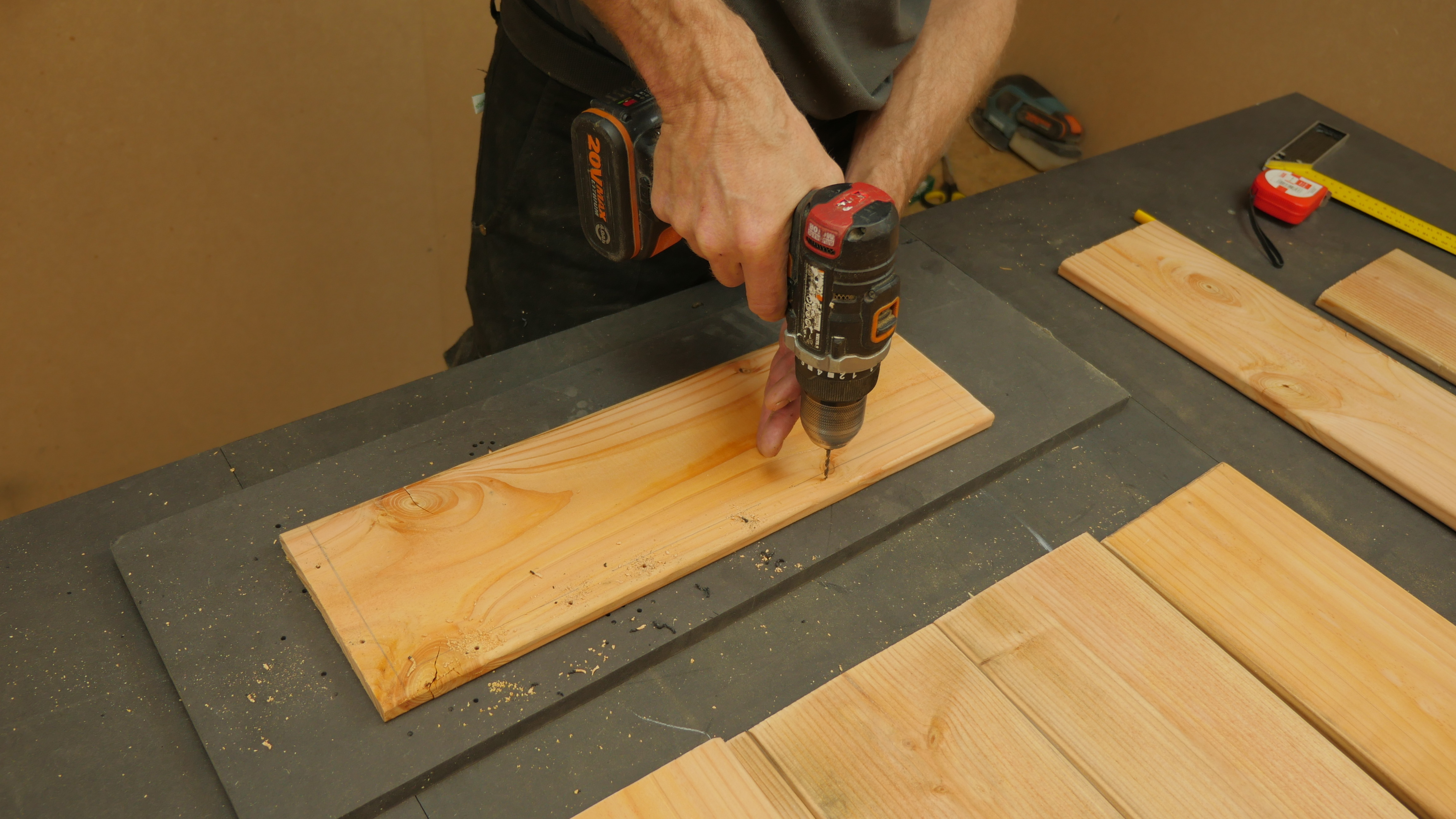Zet de plank stevig vast met een lijmklem zodat deze tijdens het boren niet verschuift. Plaats een extra plankje onder je werkstuk om je werktafel te beschermen. Boor nu de gaten op de gemarkeerde plekken uit met een passende gatenboor. Schuur de randen van de gaten glad voor een nette afwerking.